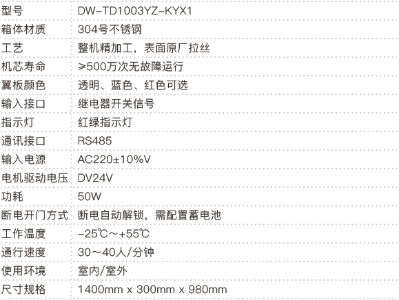 ·红绿指示灯:具有明确的通行方向指示功能,以直观的LED显示面板指示可以通行还是禁止通行